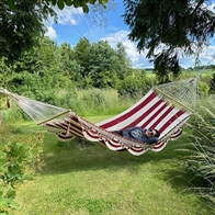 Rede Americana da coleção Deco Park Luxo com decorações, bordas e cabos extensores de madeira. Uma forma muito fina e exclusiva de artesanato, com vários detalhes, bordas, pingentes decorativos e cabos extensores de madeira exótica. O comprimento total é de aproximadamente 4 metros, com uma largura flexível, por ser confeccionada a mão com um macio algodão 100%.