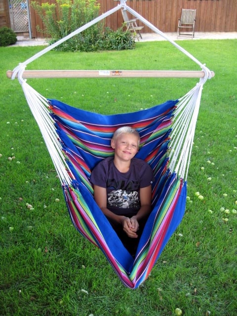 Rede-cadeira em forte tecido de algodão listrado azul. Linda e colorida.
