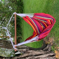 Tecido colorido 165 x 115 cm com cordões de suspensão brancos.