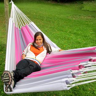 Linda rede em cores claras. Este modelo faz parte da série Outdoor PRO. Especialmente adequada para a vida ao ar livre. Cores claras encantadoras com seus tons de rosa e branco. O comprimento total é de 4 metros. A área de deitar é de 165 x 240 cm. Os cordões lateraissão na cor branca.